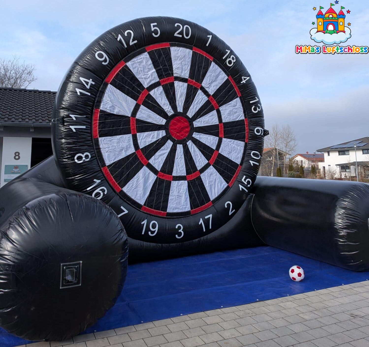 Statt Pfeile schießt man mit speziellen Klett-Fußbällen auf die Zielscheibe.